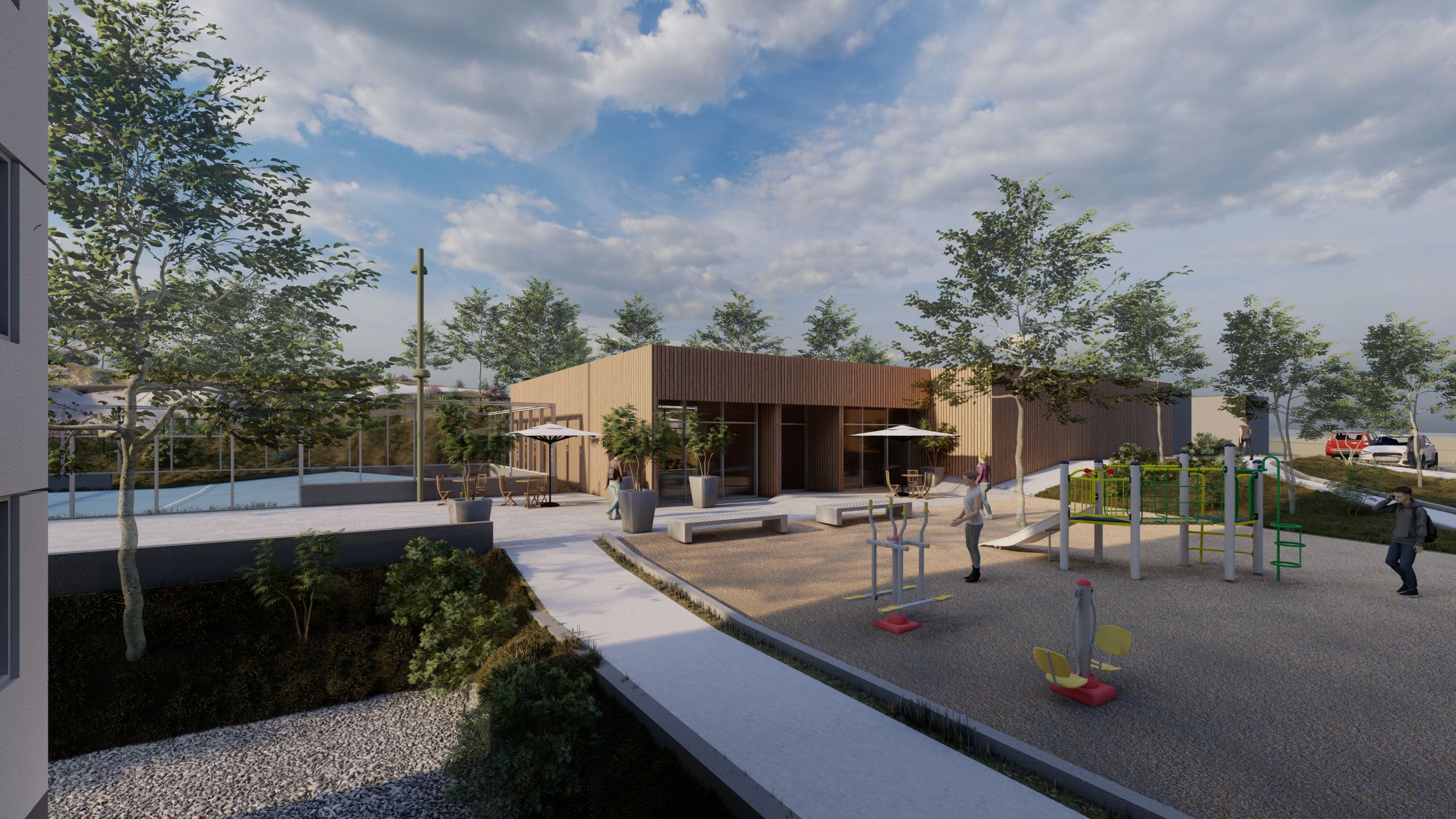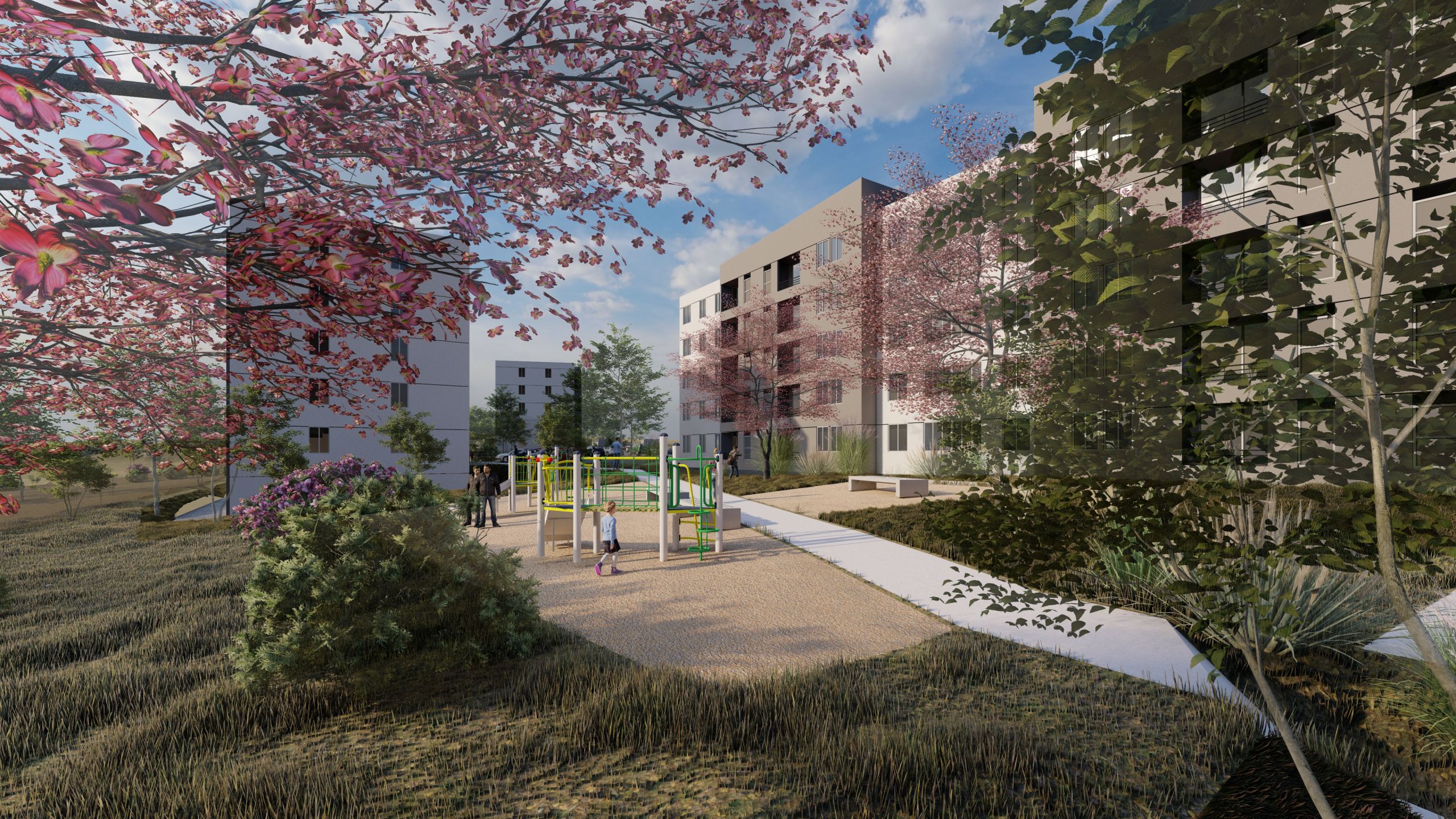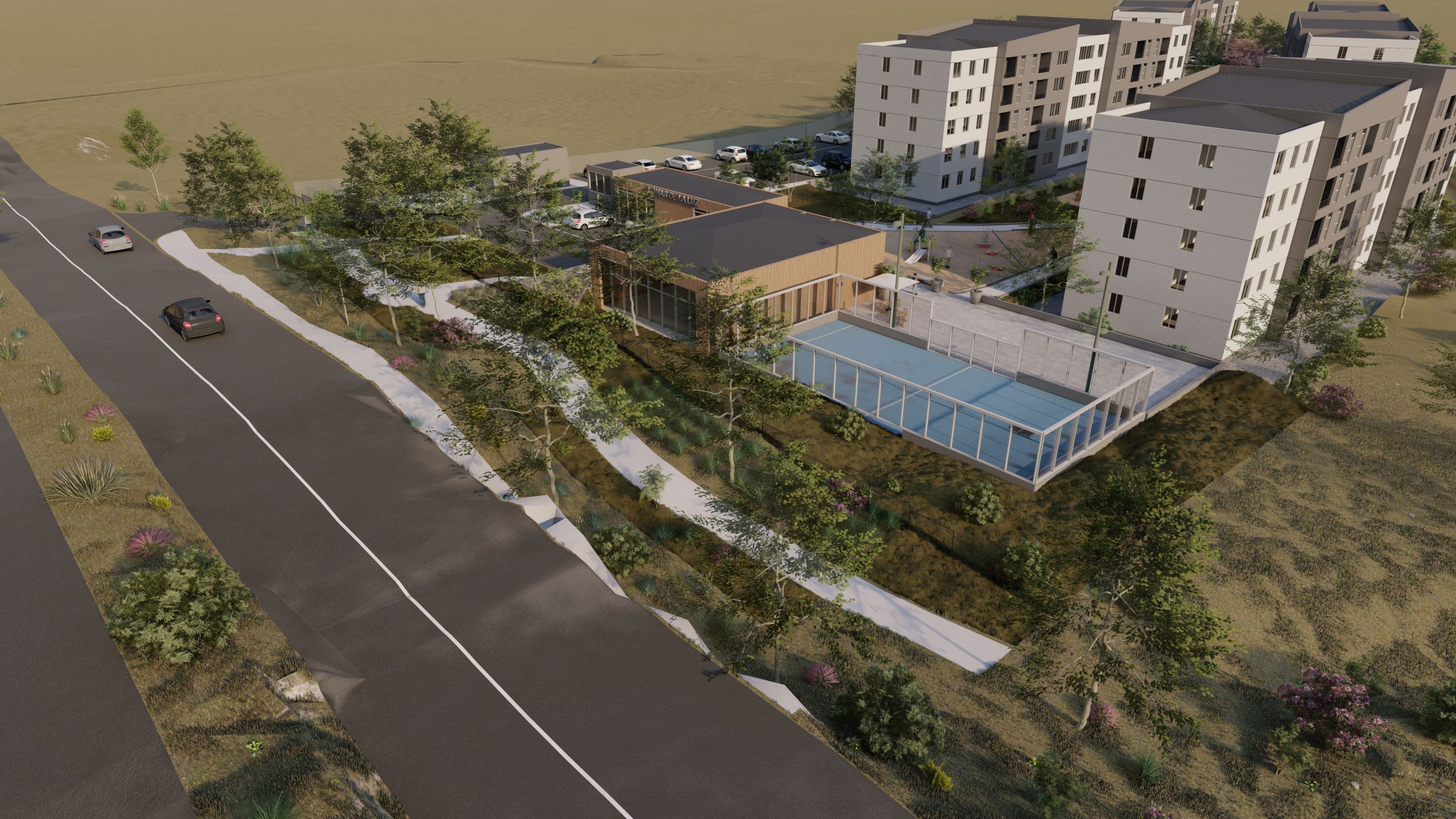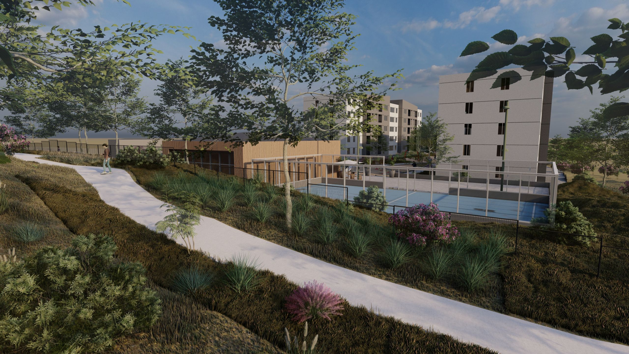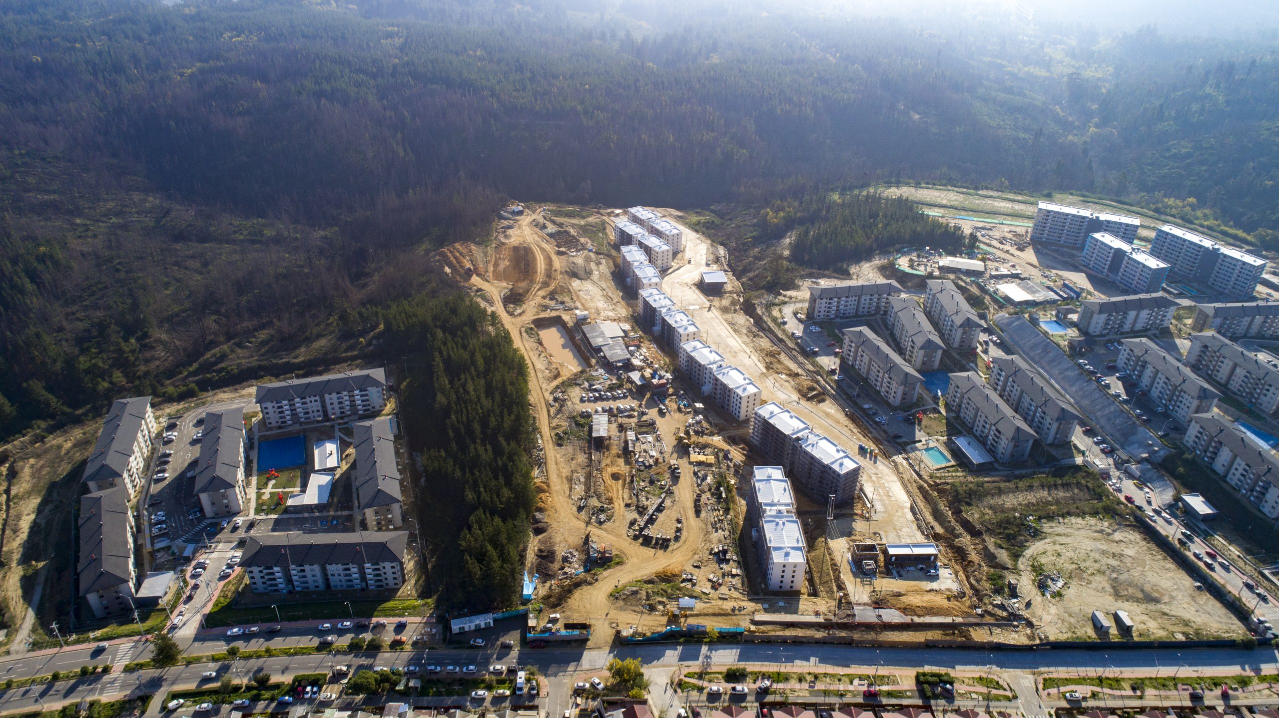 El proyecto cuenta con 7 edificios y 300 departamentos, además de quinchos, sala multiuso, juegos infantiles, bicicleteros, locales comerciales y cancha de pádel.
