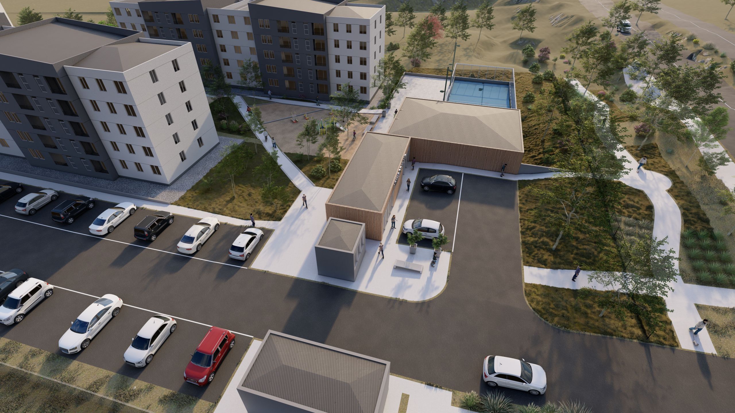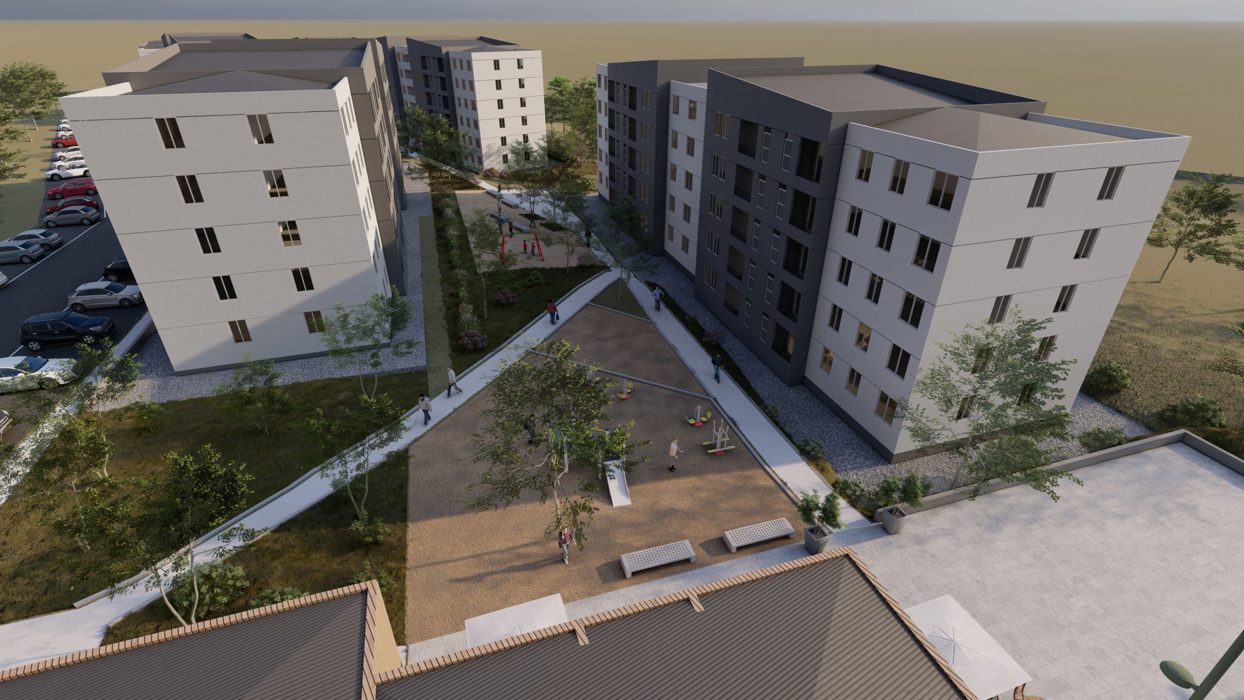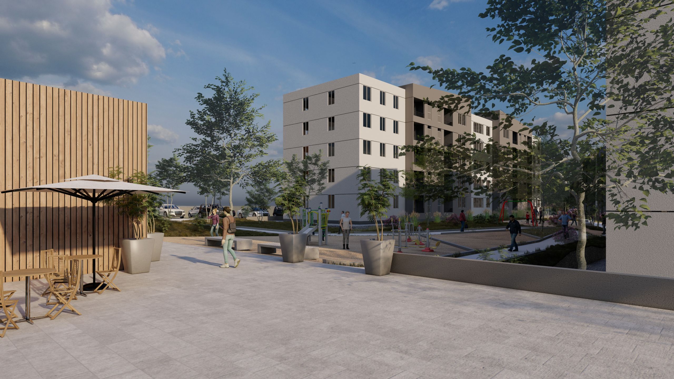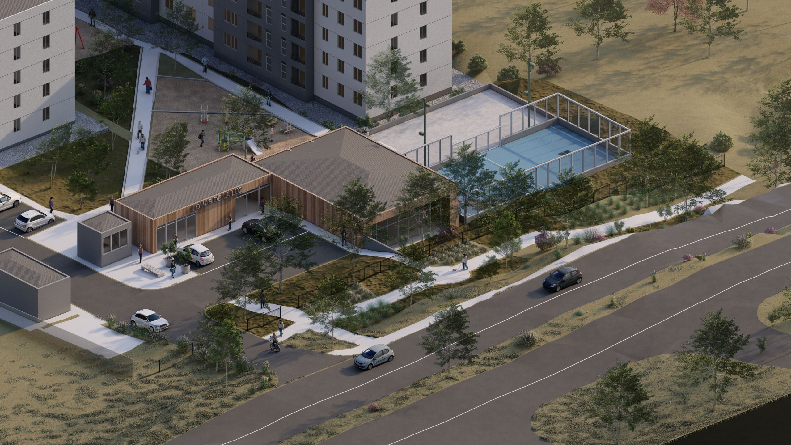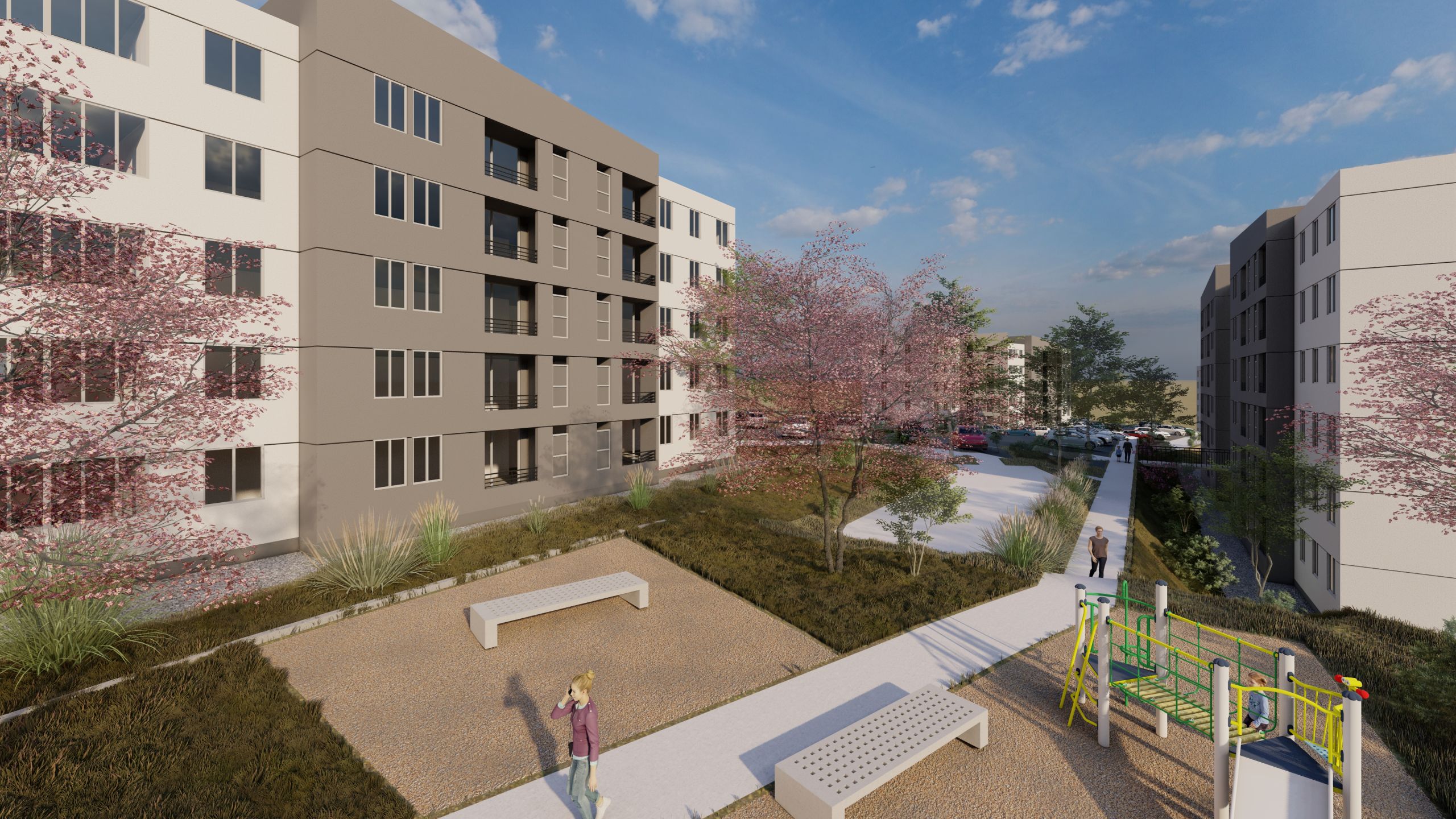El proyecto cuenta con 7 edificios y 300 departamentos, además de quinchos, sala multiuso, juegos infantiles, bicicleteros, locales comerciales y cancha de pádel.